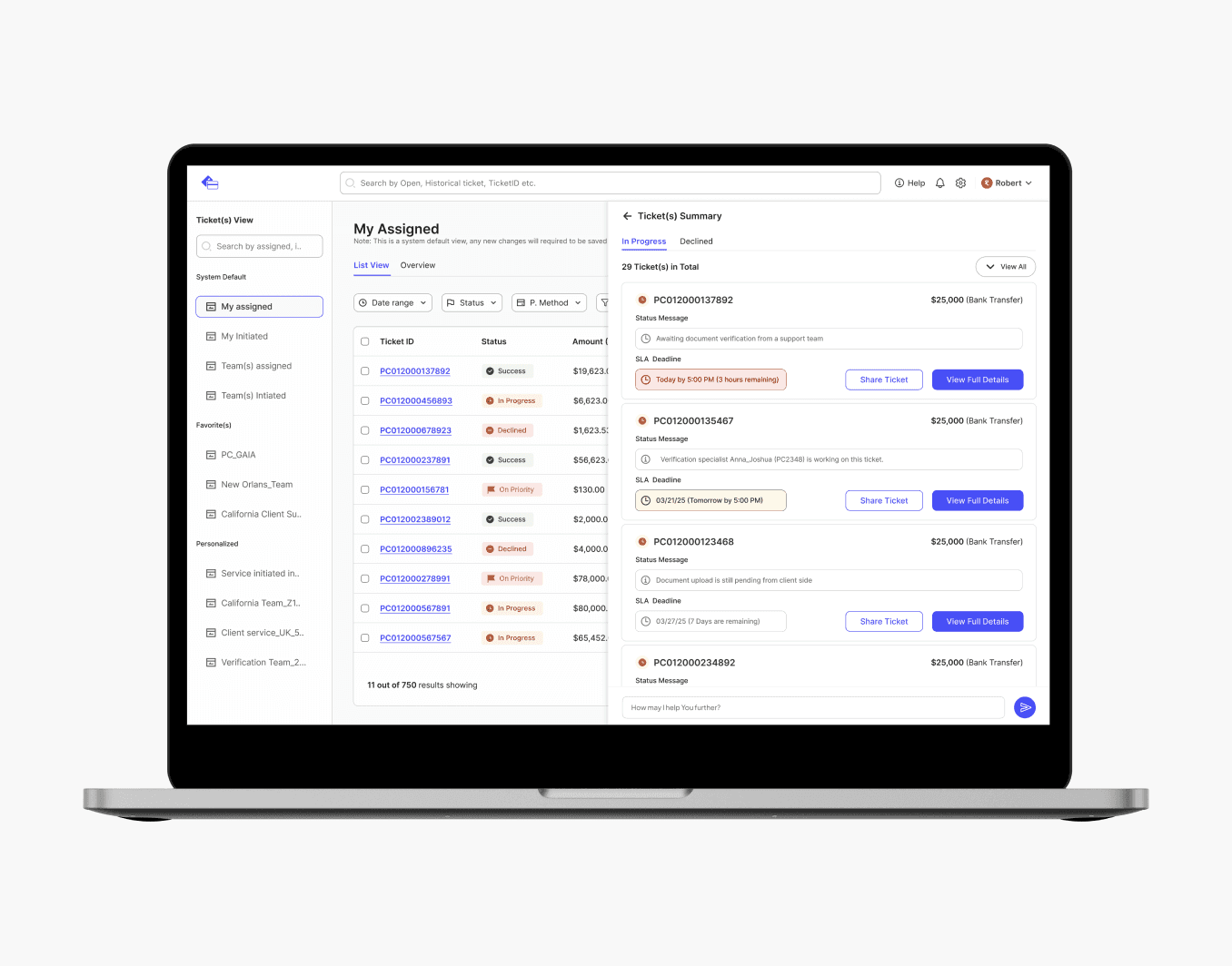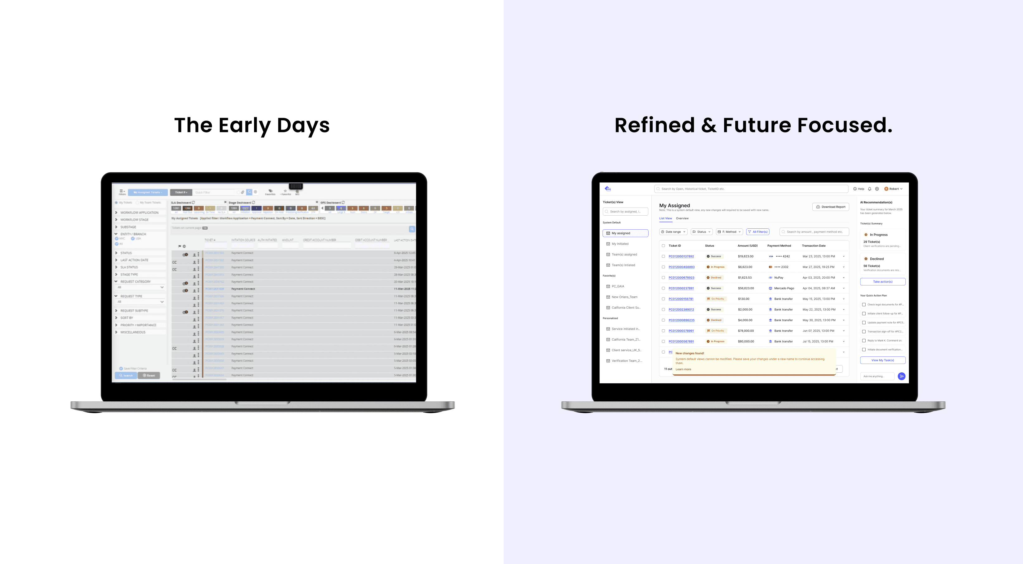The new flow organizes payment data through clearer hierarchy and structured states. Role-aware access is surfaced transparently rather than buried in system logic. Ticket handling is embedded directly within contextual views, reducing back-and-forth navigation.