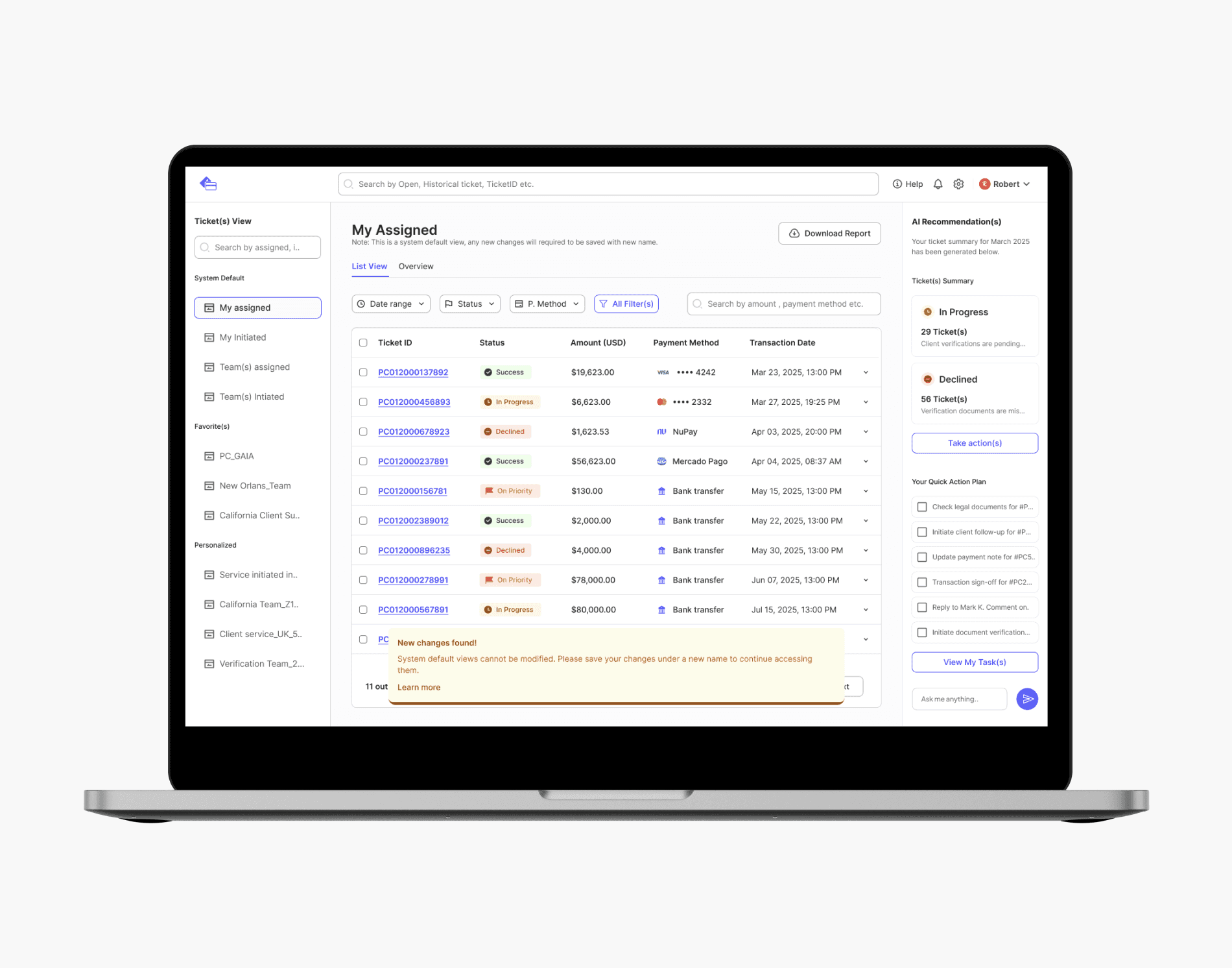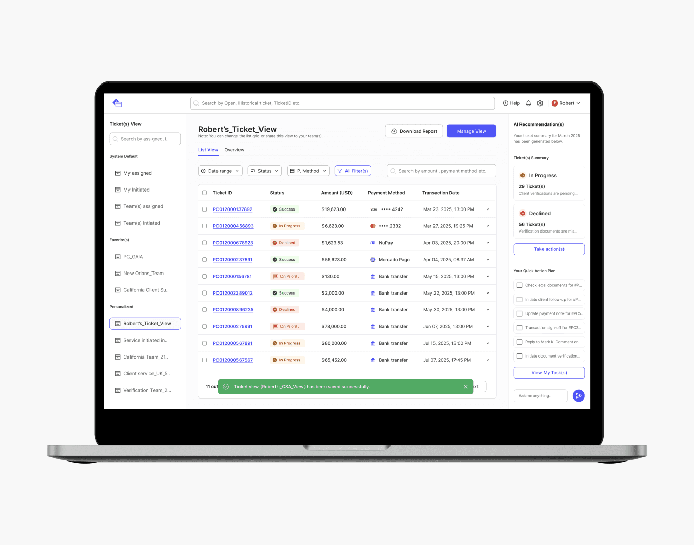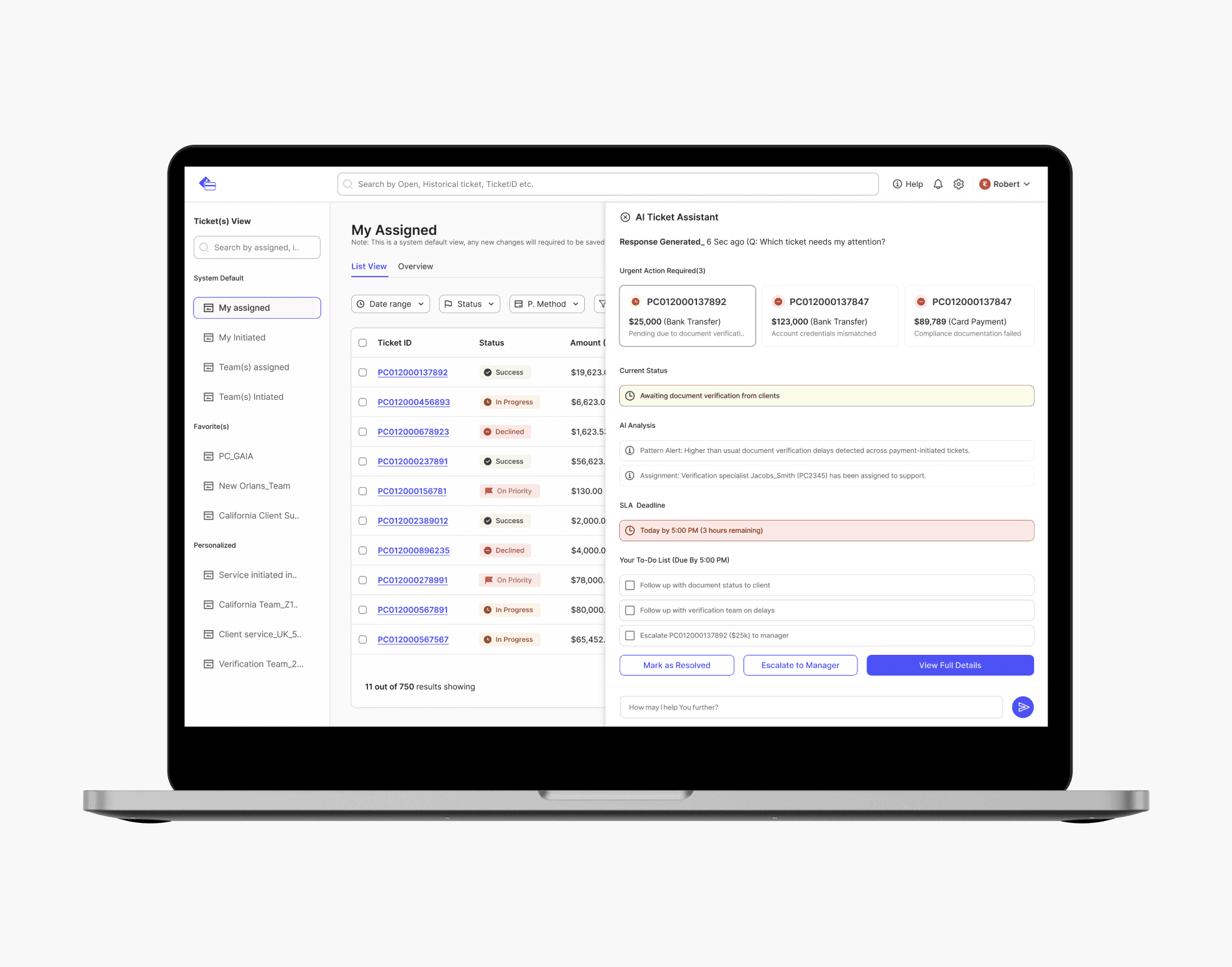 Transformed a complex payment blotter into an AI-assisted command center, cutting task time to <3 minutes, reduced ticket allocation per team <2000 and improving multi-team operational clarity.