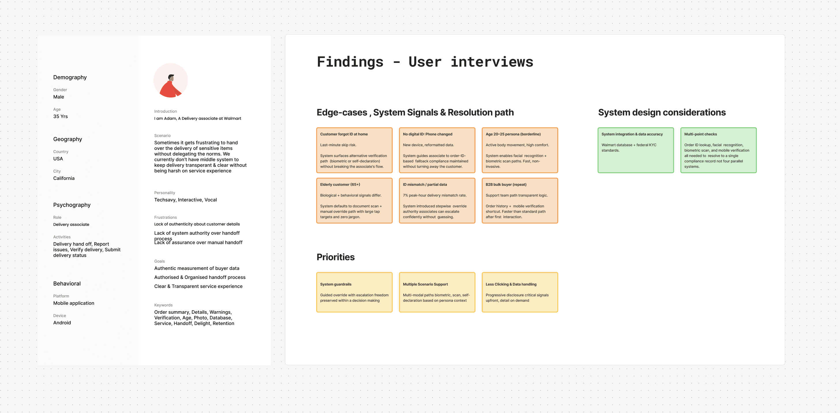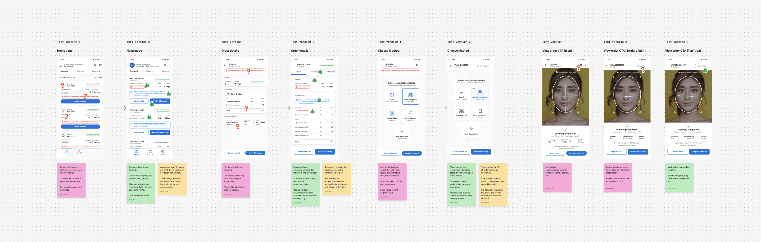 In 18+ associate interviews, we uncovered recurring friction in the verification flow. 3.5% of orders resulted in verification errors, often triggered by unclear prompts and override paths. 25% of customers arrived without valid ID, pushing associates into improvised decisions. During peak hours, step ambiguity led to hesitation contributing to a 7% abandonment rate.