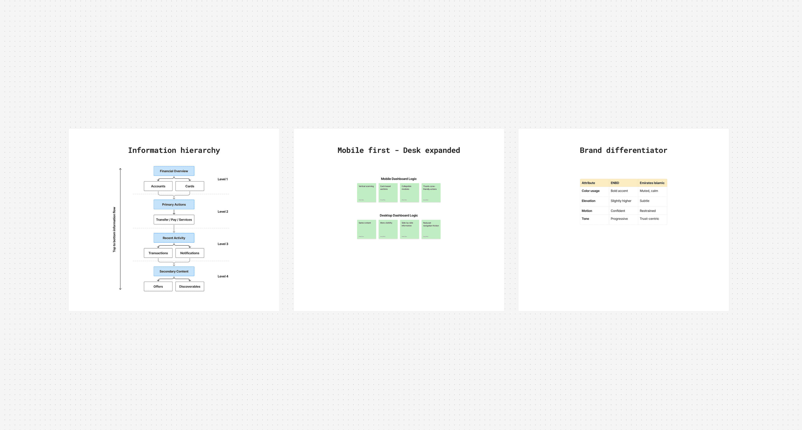 I began by defining a layered information hierarchy aligned to user mental models. The dashboard prioritizes total balance, followed by accounts and cards, recent activity, primary actions, and finally secondary discovery