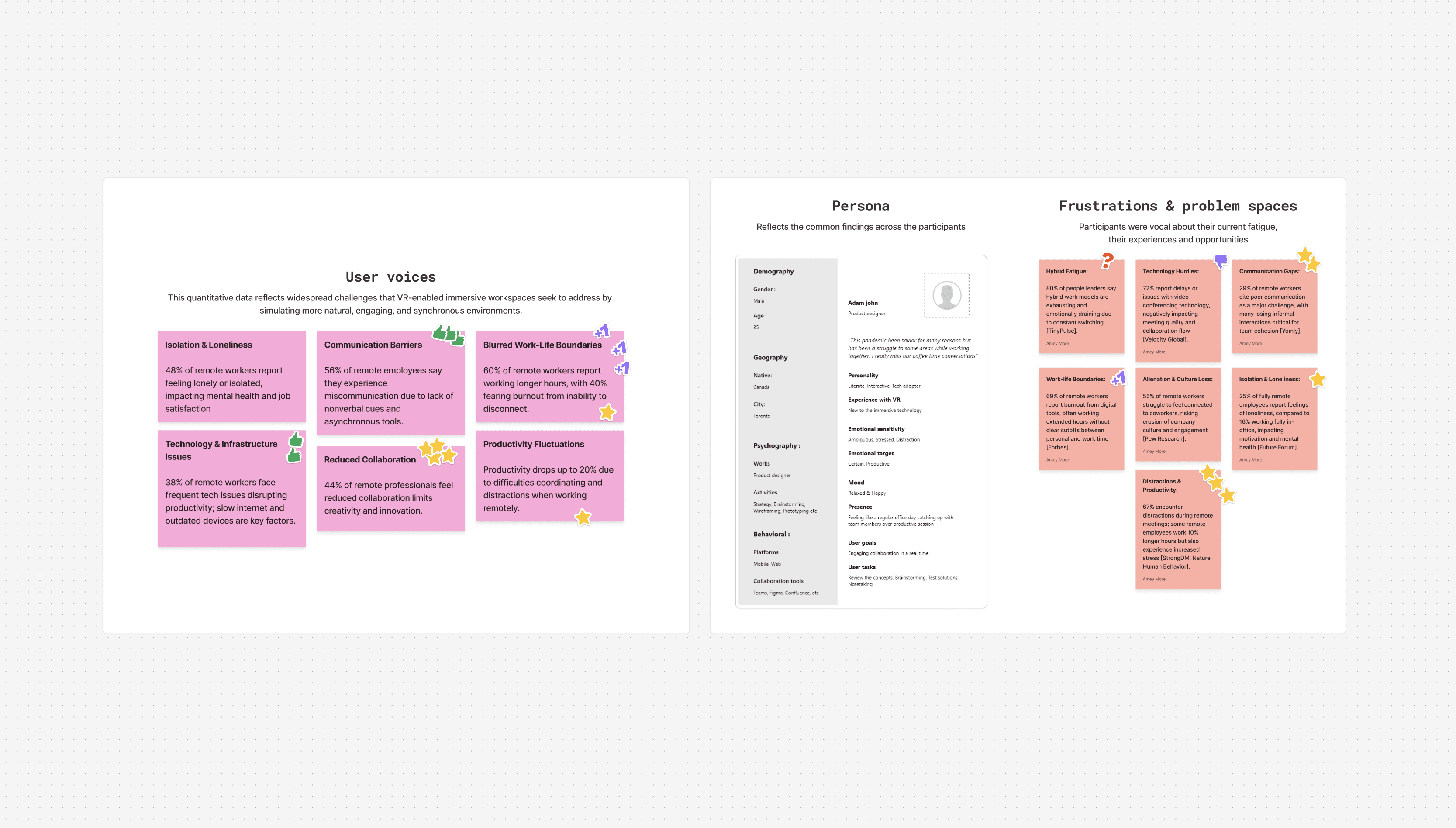 Quantitative signals reinforced this pattern: 71% reported losing time to screen switching, 78% experienced video fatigue, and 62% lost focus in meetings lacking spatial or visual cues.